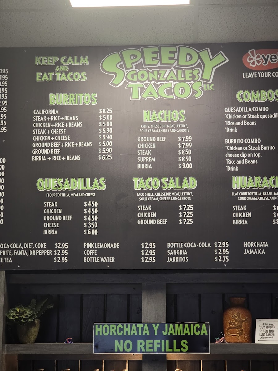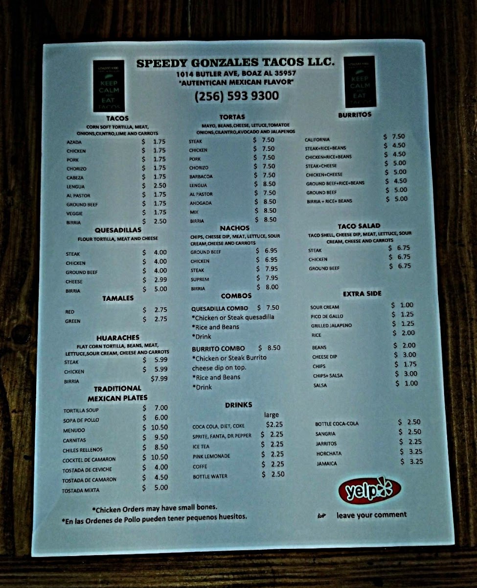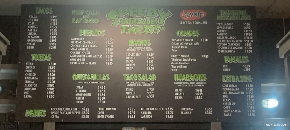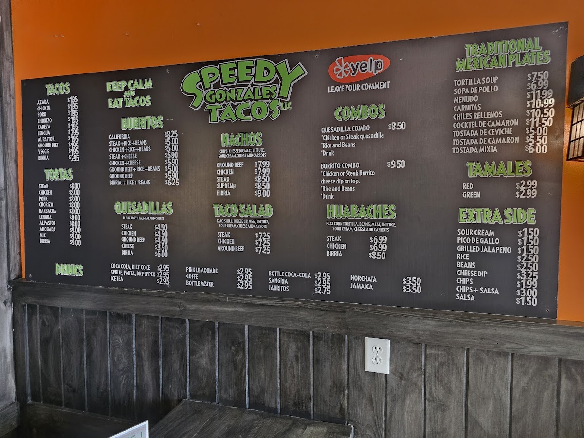 If you’re around Boaz and craving some quick, flavorful bites, the Speedy Gonzales Tacos, Llc. Menu hits the spot with its lively mix of Mexican favorites. The place keeps things simple but delicious, offering everything from soft and crunchy tacos to cheesy burritos and loaded nachos that come out fresh and fast. There’s a homestyle comfort in every dish - juicy meats, warm tortillas, and toppings that burst with flavor, whether you go for classic beef, tender chicken, or something a bit spicier. You’ll also find combo plates perfect for those who want a little bit of everything, plus sides like rice, beans, and chips with zesty salsa. Located at 2210 US-431 in Boaz, Alabama, this spot keeps the local crowd coming back for that satisfying mix of authentic taste and quick service that feels just right for any casual meal.